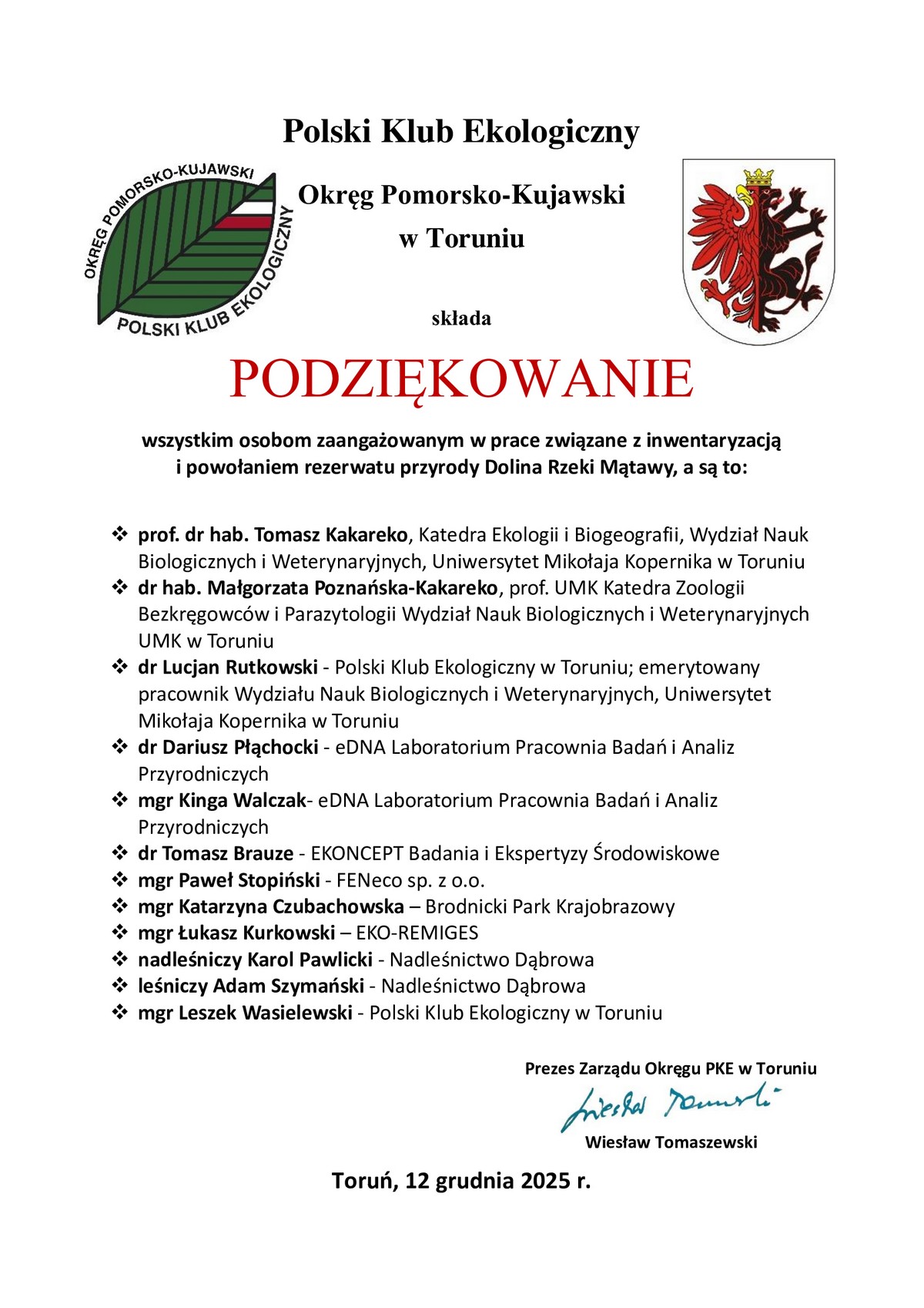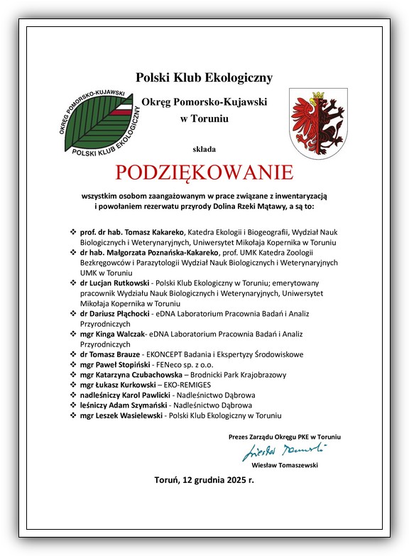 W imieniu Zarządu PKE w Toruniu dziękuję Pracownikom Nadleśnictwa Dąbrowa i całemu gronu Koleżeństwa za wkład włożony w przygotowanie, zarówno wniosku inicjującego, jak również za opracowaną inwentaryzację przyrodniczą. Stosowne podziękowanie imienne zostało podpisane przez Wiesława Tomaszewskiego – Prezesa PKE w Toruniu (w załączeniu).