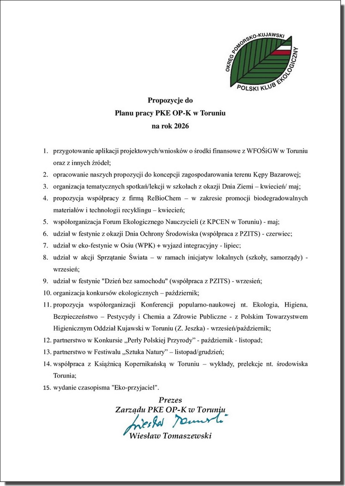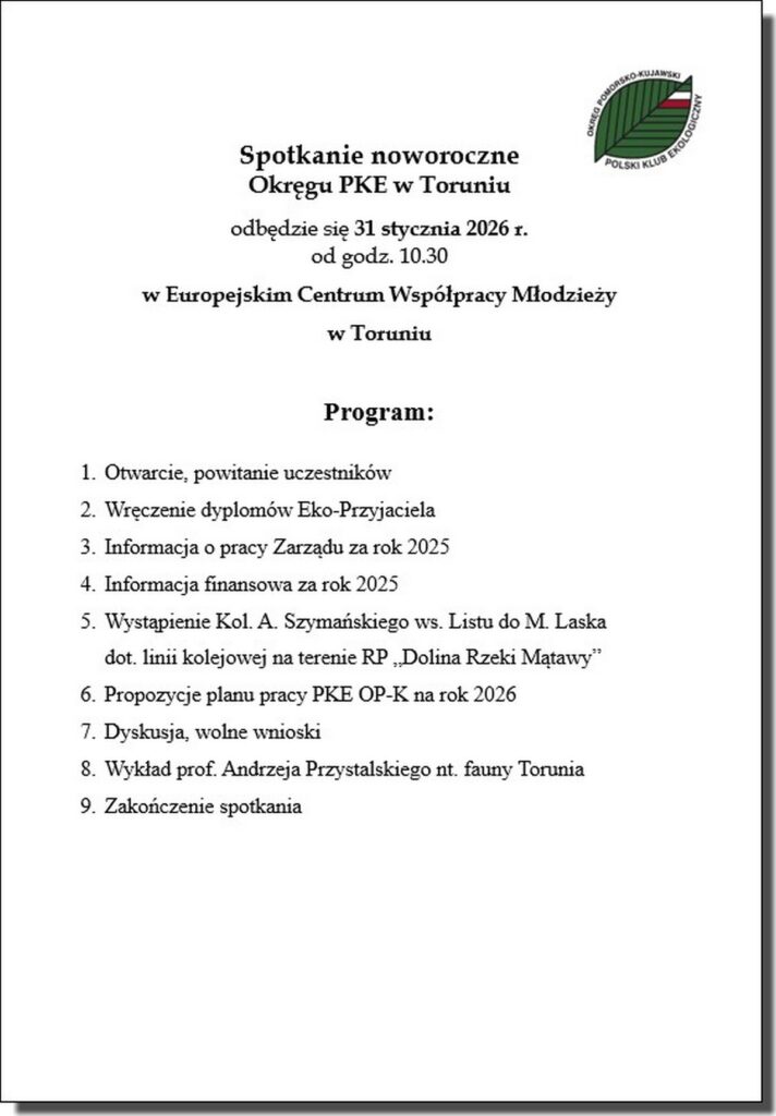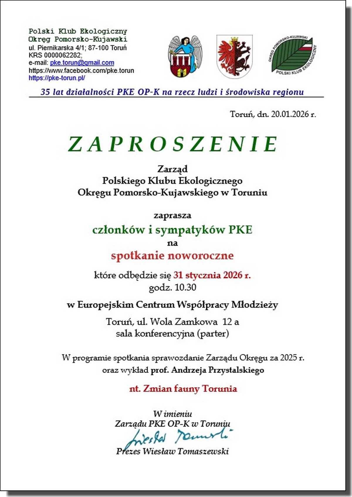 Zgromadzeni członkowie Okręgu i zaproszeni gości zostali zapoznani z informacją dotyczącą prac Zarządu oraz finansową za rok 2025. W kolejnym punkcie kolega Adam Szymański przedstawił temat listu do M. Laska dot. linii kolejowej na terenie RP „Dolina Rzeki Mątawy”. Istotnym punktem spotkania było przedstawienie propozycji planu pracy PKE OP-K na rok 2026. Na zakończenie spotkania wysłuchaliśmy fascynującego wykładu nt. zmian fauny Torunia prof. Andrzeja Przystalskiego – Laureata Nagrody Marszałka WK-P w 2025 r.